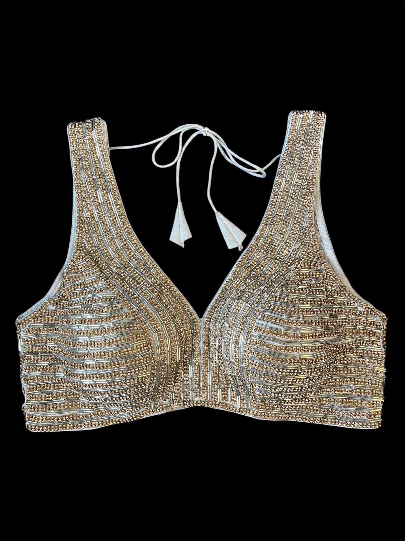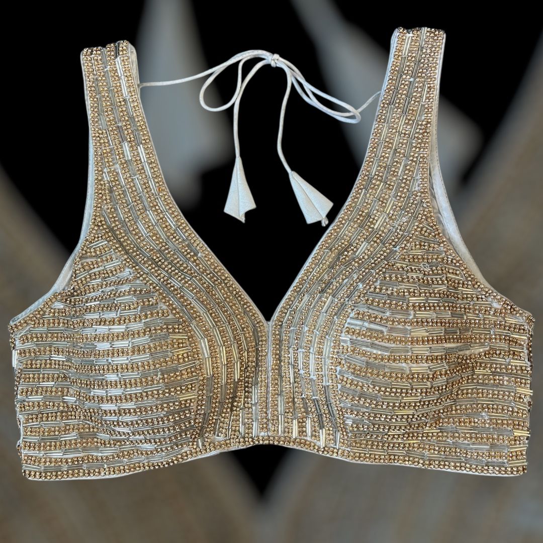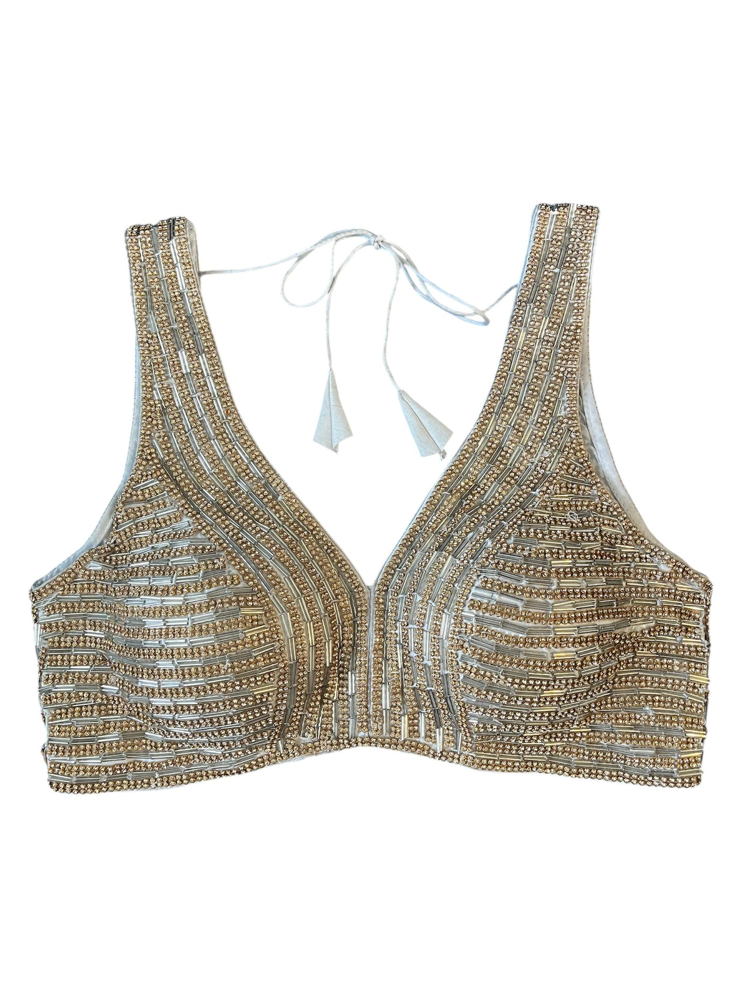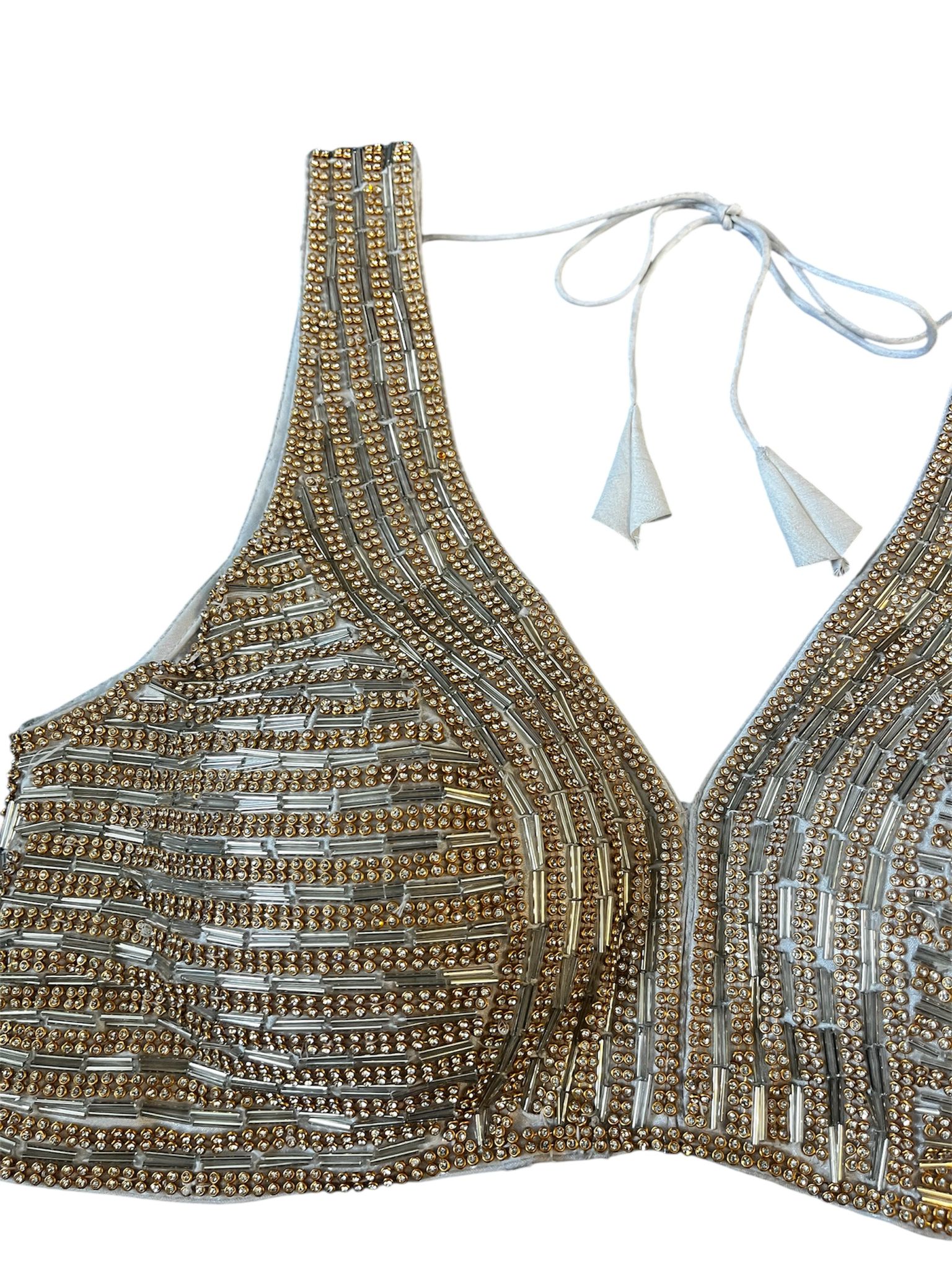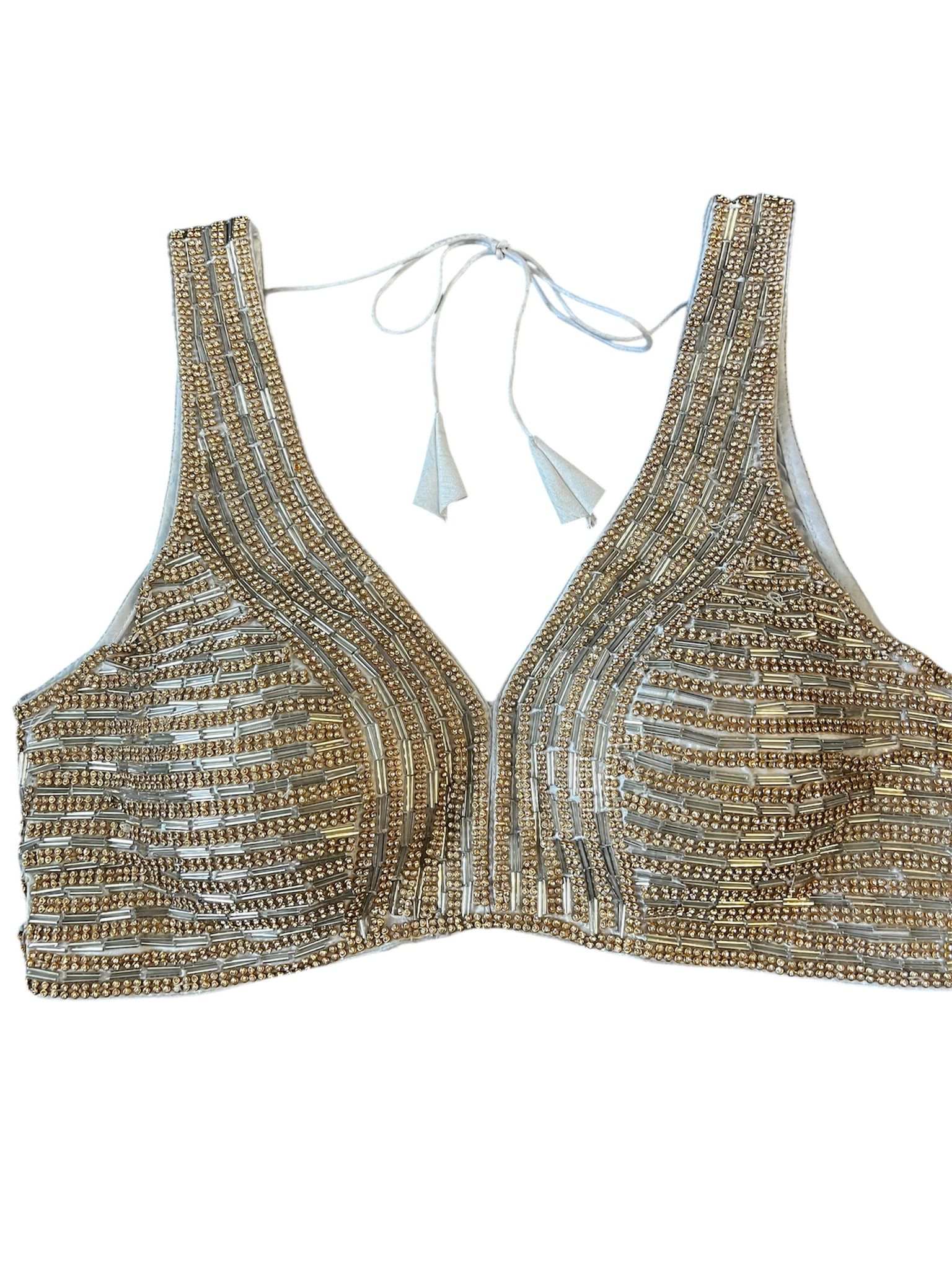 Indian Designer gold Saree Lehenga Blouse Sleeveless sabyasachi style